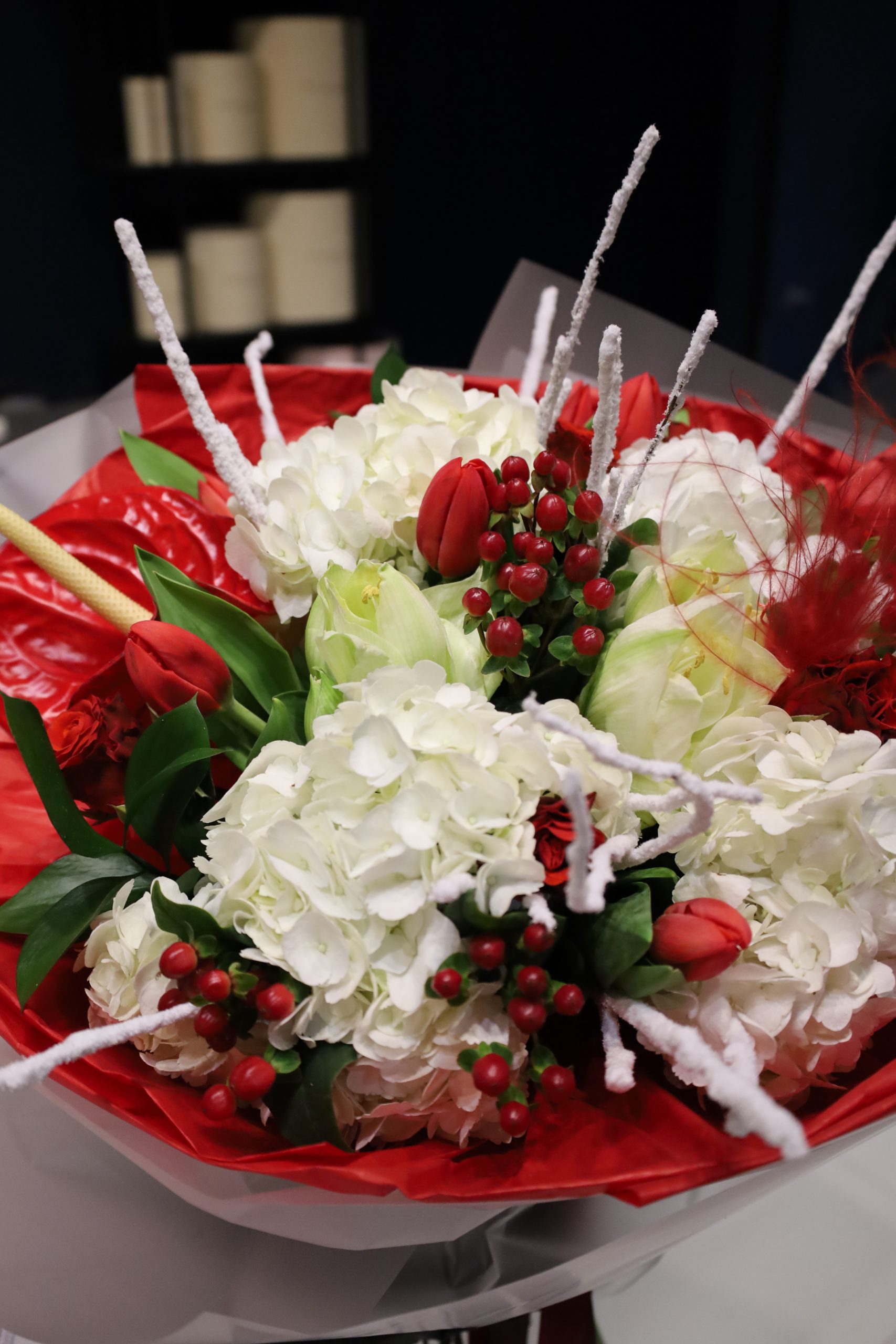 Elegancki bukiet z białą hortensją, intensywnie czerwonymi tulipanami i głębokim, bordowym anturium zachwyca kontrastem kolorów. To wyrazisty prezent pełen pasji, klasy i nowoczesnej elegancji.