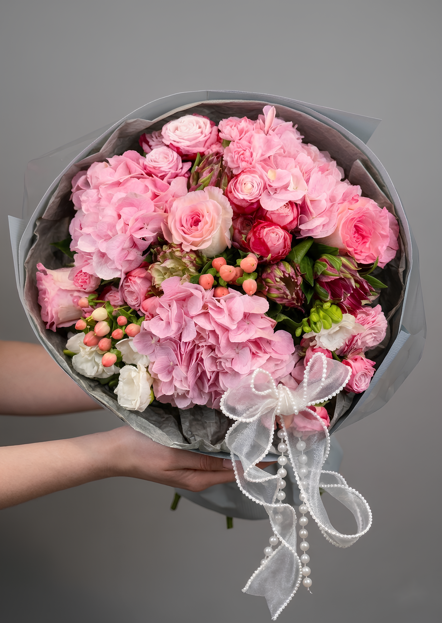 Romantyczny bukiet z różową hortensją, pachnącą frezją, delikatną różą gałązkową i alstremerią urzeka lekkością i świeżością. Idealny, by wyrazić czułość, radość i szczere emocje.