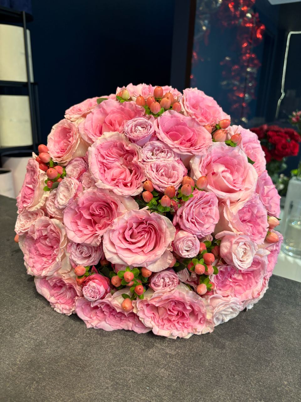 Romantyczny bukiet z różowych róż piwoniowych, delikatnej róży gałązkowej oraz dekoracyjnego hypericum zachwyca subtelną elegancją. To idealny wybór, by wyrazić czułość, miłość i wyjątkowe emocje.