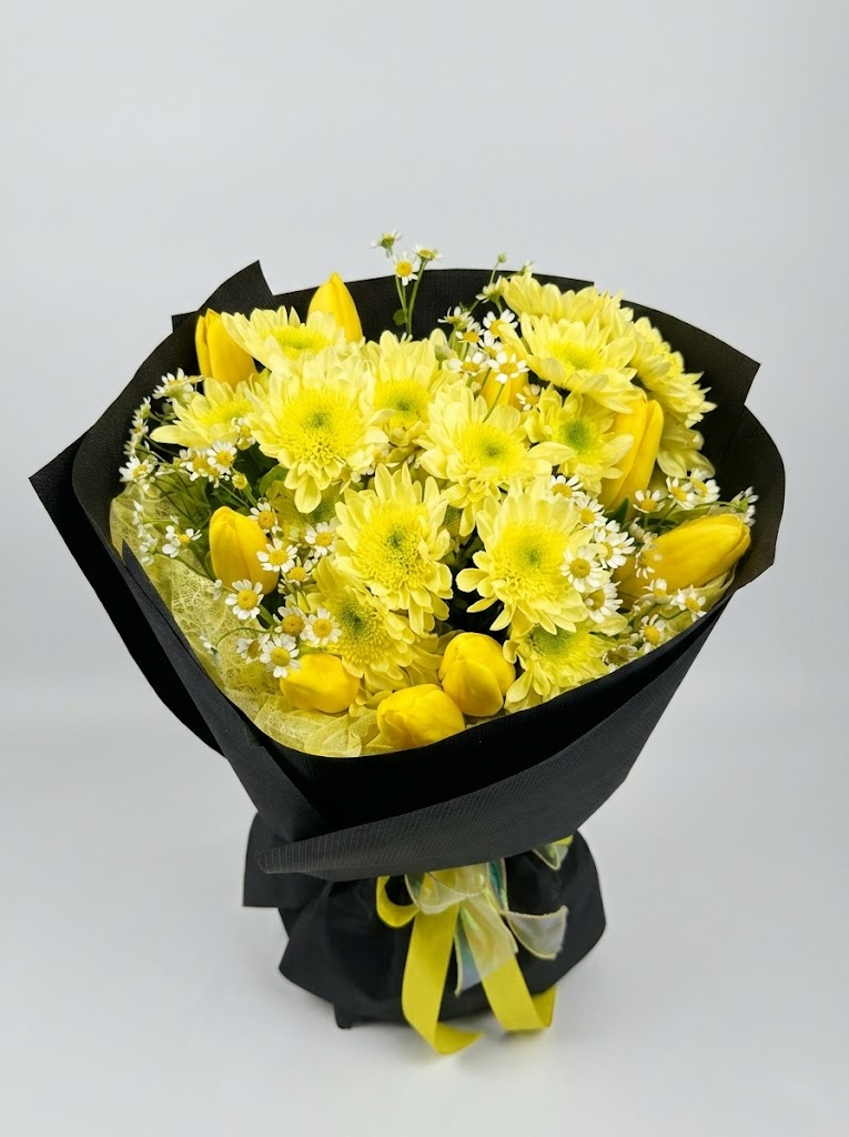 Ten nowoczesny bukiet łączy słoneczną żółć chryzantemy i tulipanów z lekkością tanacetum, tworząc harmonijną i radosną kompozycję. Stylowe czarne opakowanie podkreśla intensywność kolorów i nadaje całości elegancki, designerski charakter. To idealny wybór dla osób ceniących minimalizm i wyrazisty styl. Bukiet emanuje świeżością, optymizmem i nowoczesną estetyką.