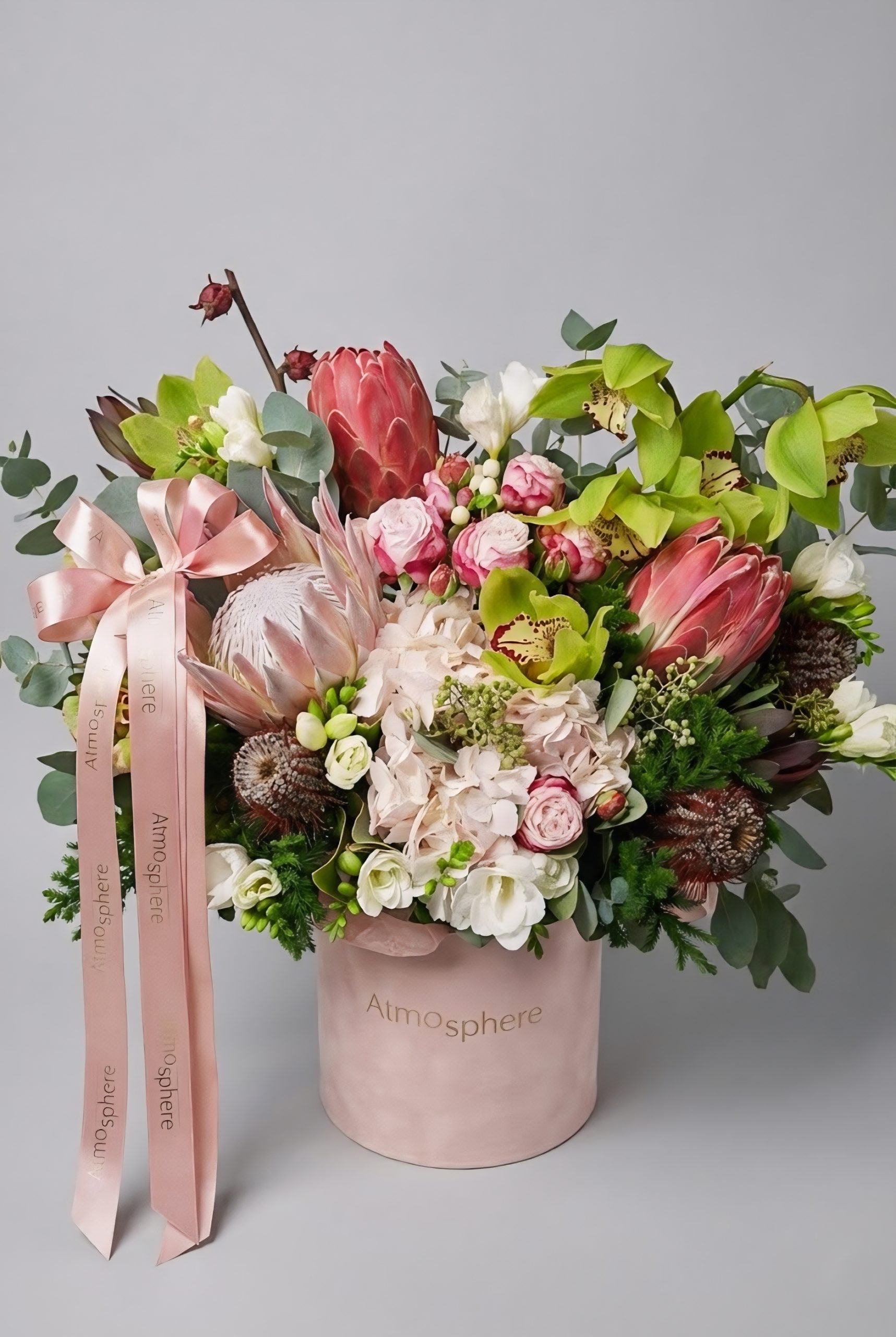 Ta wyjątkowa kompozycja w flower boxie została stworzona z egzotycznych kwiatów, które przyciągają uwagę swoją formą i intensywnymi kolorami. Królewska protea, różowa protea i leucospermum nadają aranżacji spektakularny charakter, a róża gałązkowa, cymbidium, hortensja i frezja dopełniają całość elegancją i świeżością. To propozycja dla tych, którzy szukają niebanalnego, luksusowego prezentu. Kompozycja emanuje siłą, stylem i wyjątkowym prestiżem.