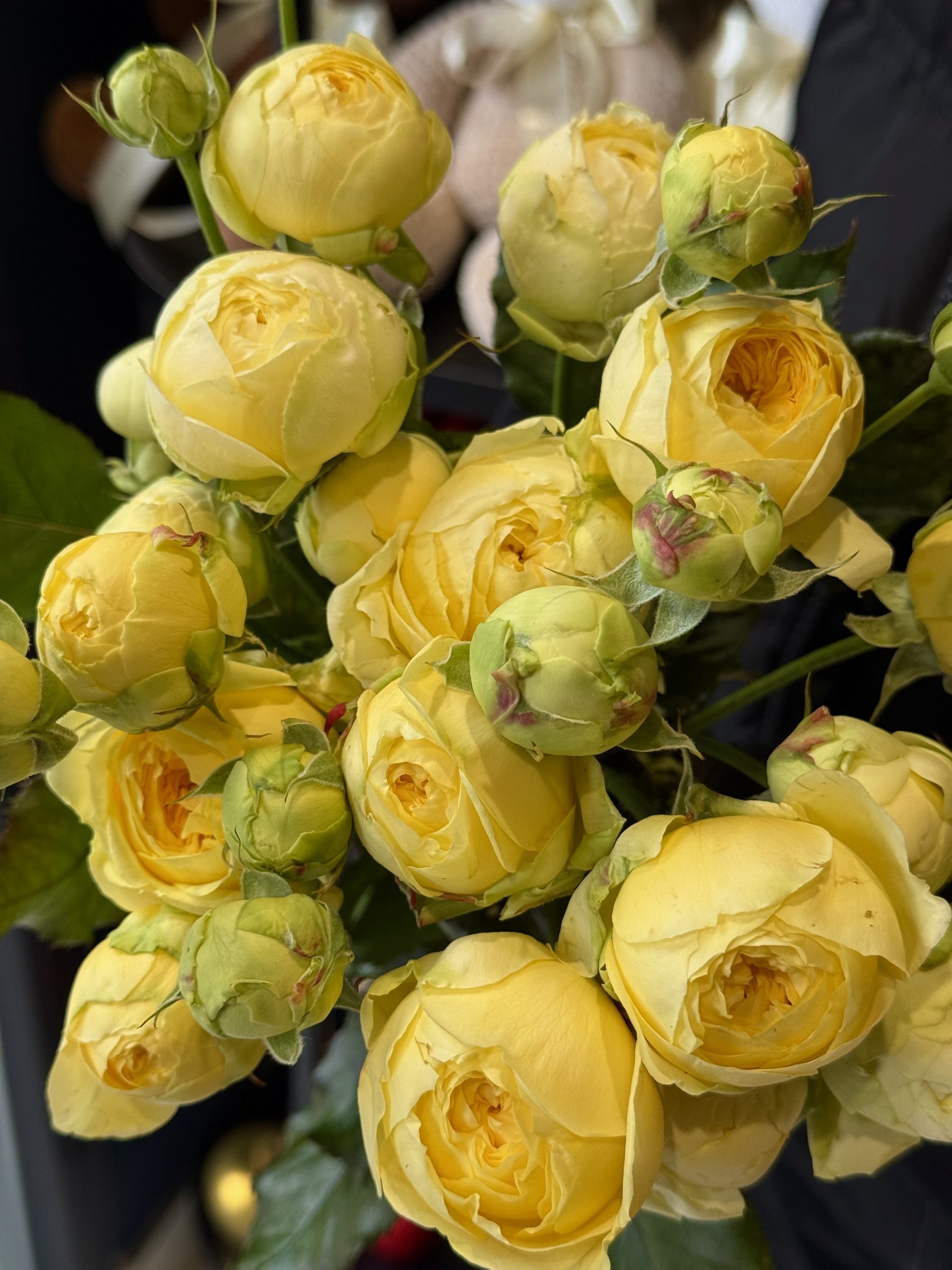 Ta róża gałązkowa o delikatnym, jasnożółtym kolorze emanuje świeżością, lekkością i naturalną elegancją. Liczne drobne kwiaty na jednej gałązce tworzą harmonijną i pełną objętości kompozycję, która doskonale sprawdza się zarówno w klasycznych, jak i nowoczesnych bukietach.